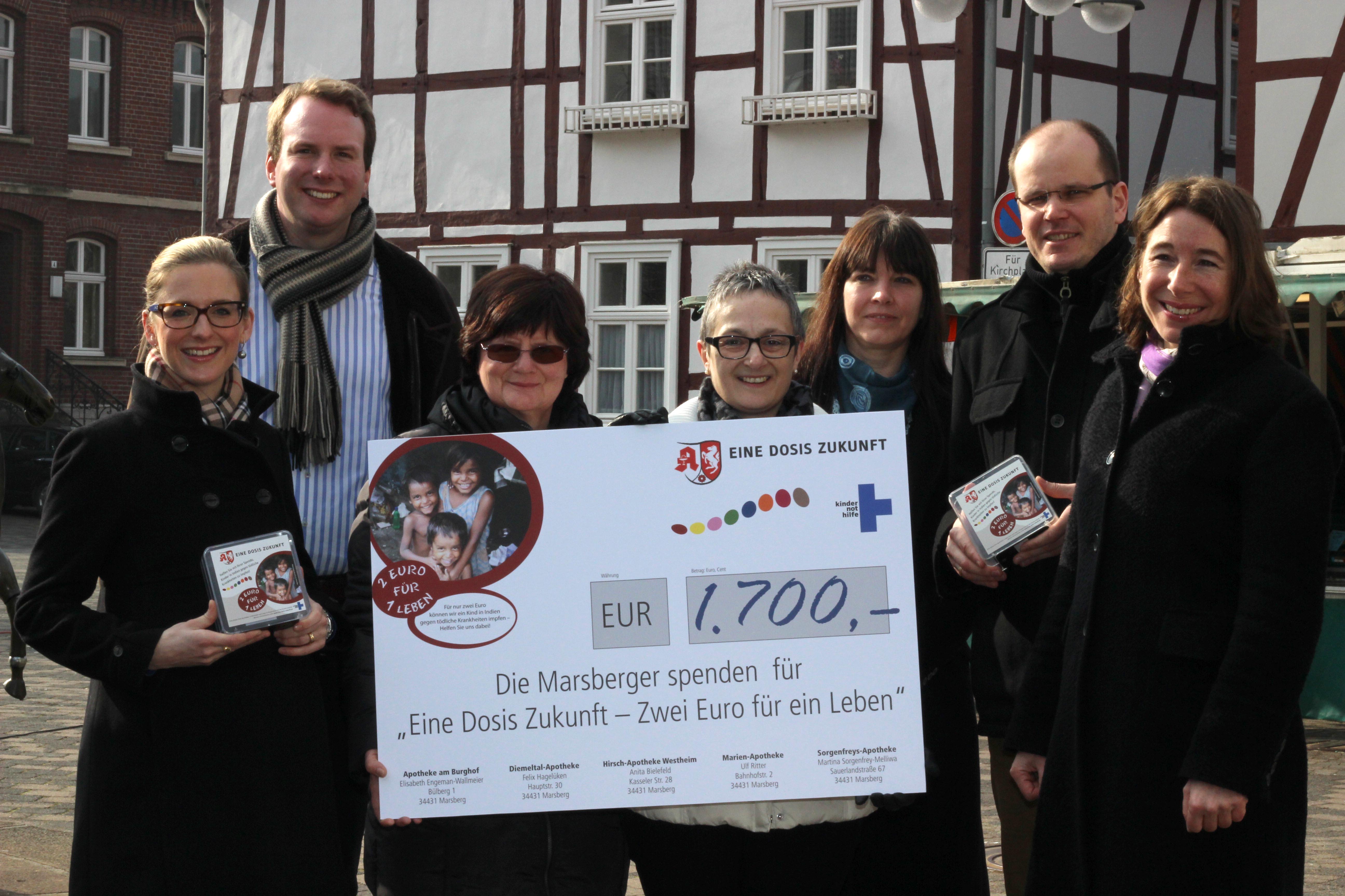 Stolze 800 Euro haben Kunden aller fünf Marsberger Apotheken in der Weihnachtszeit 2013 für das Hilfsprojekt „Eine Dosis Zukunft – Zwei Euro für ein Leben“ in die Spendenboxen geworfen. Die Apotheken-Inhaber haben dieses hervorragende Ergebnis zum Anlass genommen, um selbst einen zusätzlichen Beitrag zu leisten und den Betrag kurzerhand verdoppelt und aufgerundet. Insgesamt sind also 1.700 Euro für das gemeinsame Hilfsprojekt der Westfälisch-lippischen Apothekerschaft und der Kindernothilfe zusammengekommen, freuen sich die beteiligten Apotheker über das gute Ergebnis der Spendensammlung.